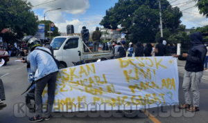 Dalam aksi tersebut massa yang mengatas namakan Aliansi Peduli UKM dan UMKM Kabupaten Pinrang membentangkan spanduk yang bertuliskan