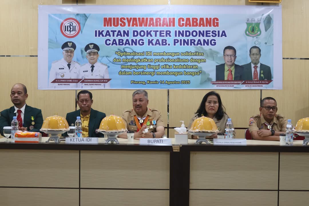 KABAREALITA.COM-PINRANG SULSEL– Bupati Pinrang H. A. Irwan Hamid, S.Sos berkesempatan menghadiri Musyawarah Cabang (Muscab) Ikatan Dokter Indonesia (IDI) Kabupaten Pinrang yang digelar di ruang rapat Rumah Sakit Umum Daerah Lasinrang Pinrang, Kamis (14/8).