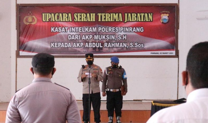 KABAREALITA.COM-PINRANG, Kapolres Pinrang AKBP M. Arief Sugihartono, S.IK, MT memimpin pelaksanaan serah terima jabatan (Sertijab) Kasat Intelkam Polres Pinrang, bertempat di Aula Quick Wins Polres Pinrang, Jl. Bintang No.3 Pinrang. Selasa (2/3/2021).