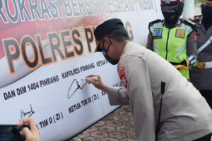 Selanjutnya dilaksanakan Penandatanganan deklarasi pembangunan Zona Integritas (ZI) Polres Pinrang yang diawali oleh Bupati Pinrang, dan dilanjutkan oleh DPRD Pinrang, Dandim 1404/Pinrang, Kapolres Pinrang, Ketua Pengadilan Negeri Pinrang, Kajari Pinrang, Ketua Pengadilan Agama Pinrang dan Ka Rutan Kelas II B Pinrang.