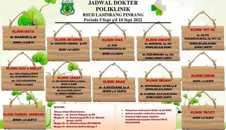 Terpantau pada salah satu laman Sosial Media milik RSUD Lasinrang yang di-update hampir pada setiap hari Ahad setiap pekannya, tercantum jadwal Dokter Ahli atau Spesialis yang ada pada poliklinik dalam sepekan serta dicantumkan pula link dan tata cara melakukan pendaftaran Online dengan 2 cara.