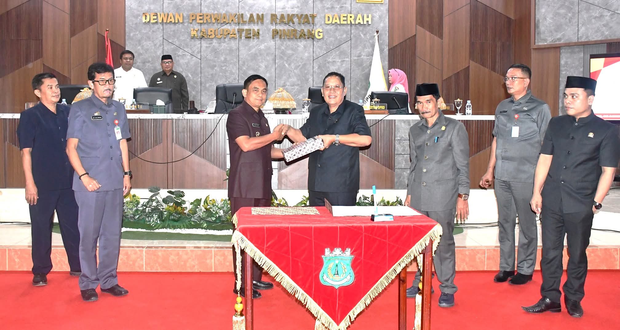 Dalam kata pengantarnya, Ketua DPRD Pinrang, H. Nasrun Paturusi mengungkapkan, rancangan KUPA dan PPAS Perubahan Tahun Anggaran 2025 sebagaimana diamanatkan dalam Peraturan Pemerintah Nomor 12 Tahun 2019 tentang pengelolaan keuangan daerah yang menjadi acuan dalam penyusunan Anggaran Pendapatan dan Belanja Daerah Tahun 2025, Bupati Pinrang menyampaikan rancangan KUPA dan PPAS Perubahan Tahun 2025. dan mengenai rancangan Peraturan Daerah diluar Program Pembentukan Peraturan Daerah Kabupaten Pinrang Tahun 2025 yaitu rancangan Peraturan Daerah tentang perubahan kedua atas Peraturan Daerah Kabupaten Pinrang Nomor 6 Tahun 2020 tentang pembentukan dan susunan perangkat daerah, telah dilakukan pembahasan di tingkat Bapemperda maupun dalam rapat konsultasi pimpinan dan menyepakati menyetujui untuk dilakukan penandatanganan keputusan bersama antara DPRD dan Kepala Daerah.