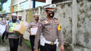 Bantuan sosial Sat Lantas dibagikan secara simbolis di halaman Mapolres Pinrang oleh Kapolres Pinrang AKBP M. Arief Sugihartono didampingi Wakapolres Pinrang Kompol Muhabar, Kasat Lantas Iptu Nawir, Kaur Bin Ops Lantas, dan Para Kanit Satlantas Polres Pinrang.