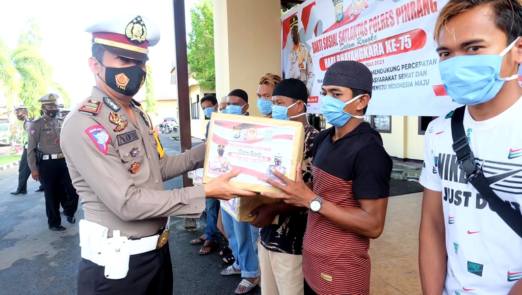 “Sebagai wujud kepedulian Polri dalam rangka menyambut hari Bhayangkara ke 75, kami Polres Pinrang melalui Satlantas membagikan Paket sembako dan masker kepada Masyarakat yang membutuhkan.” Ujarnya