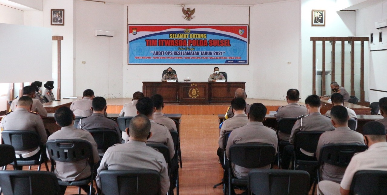 Kedatangan Tim Audit Itwasda Polda Sulsel dipimpin langsung oleh Kombes Pol Raspani, S.I.K. beserta rombongan untuk melaksanakan pemeriksaan Perwabku dan Administrasi Ops Keselamatan dan Ops Aman Nusa II Tahun 2021. yang diterima oleh Wakapolres Pinrang Kompol Kompol Drs. Andi Jamaluddin