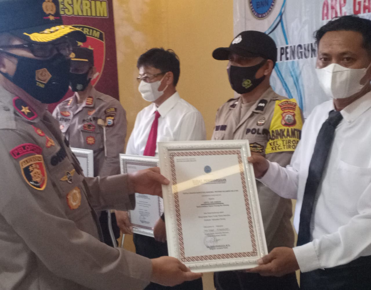 Brigjen Pol.Drs.Ghiri Prawijaya,M.Th menyerahkan secara langsung piagam penghargaan  tersebut di Aula Mapolsek Tiroang, Jalan Poros Rappang- Pinrang Km.8 kecamatan Mattiro Deceng Kabupaten Pinrang. Selasa (14/09/2021).
