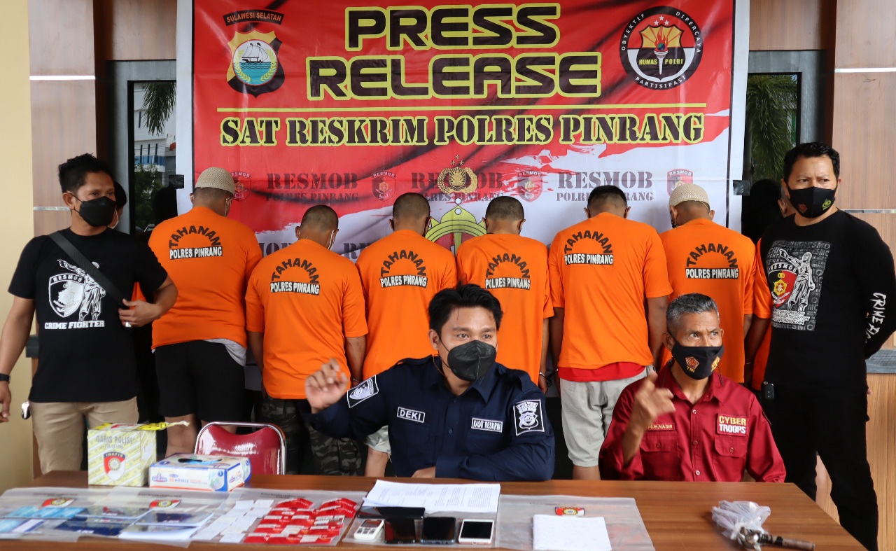 Kasat Reskrim juga mengatakan total 8 tersangka sudah diamankan Sat Reskrim Polres Pinrang yaitu 2(dua)orang Tersangka Kasus Curat Lel.HD umur 30 tahun pekerjaan Swasta alamat Jl. Andi Makkulau Lorong 4 No.199 Kel. Laleng Bata Kec. Paleteang Kab. Pinrang dan Lk. BH umur 48 tahun pekerjaan Buruh Harian Lepas alamat KTP Jl. Jend. Suprapto Kel. Baru Ulu Kec. Balikpapan Barat Kota Balikpapan Prov Kaltim, 2 (dua) orang Tersangka Kasus Curanmor Lel. YKB dan LK KM umur 33 tahun Pekerjaan tidak ada alamat Jl. D.I Panjaitan Kel. Api Api Kec. Bontang Utara Kab. Bontang Prov. Kaltim alamat lain amassangang kel. Laleng bata kec. Paleteang kab. Pinrang., 4 (empat) orang tersangka Kasus Penipuan dan Penggelapan Modus Jual Beli Online.