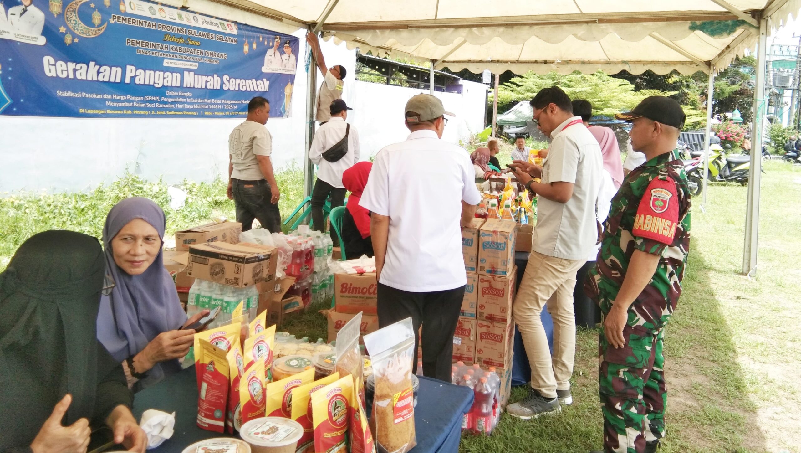 KABAREALITA.COM-PINRANG SULSEL, Babinsa Koramil 04-Kodim 1404/Pinrang Kelurahan Macorawalie Sertu Edy, melaksakan monitoring wilayah dalam pelaksanaan kegiatan Gerakan Pangan murah dalam rangka menjaga stabilitas pasokan dan harga pangan yang di laksanakan Dinas Ketahanan Pangan Kabupaten Pinrang di jalan Jenderal Sudirman (Lapangan Bosowa),Kecamat Watang Sawitto, Kabupaten Pinrang. Rabu (26/03/2025).